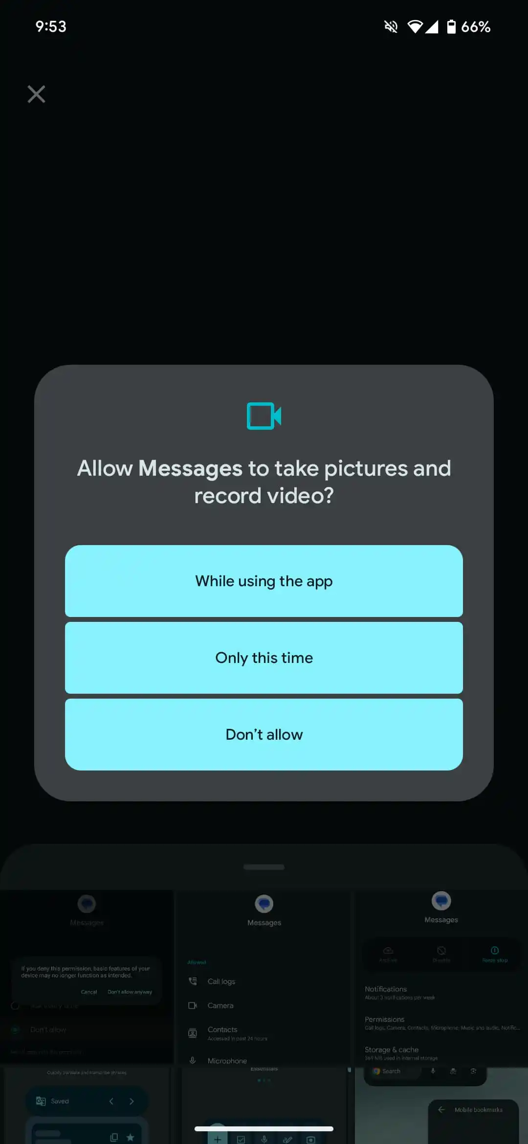 Her şey tamamlandığında, Google Mesajlar Galerisi’ni açtığınızda kamera çalışmayacak. Vizör alanında “Kamerayı kullanmak için izin verin” şeklinde bir bildirim görünecek, ancak alt kısımdaki galeri içeriklerine tam erişim sağlayacaksınız.