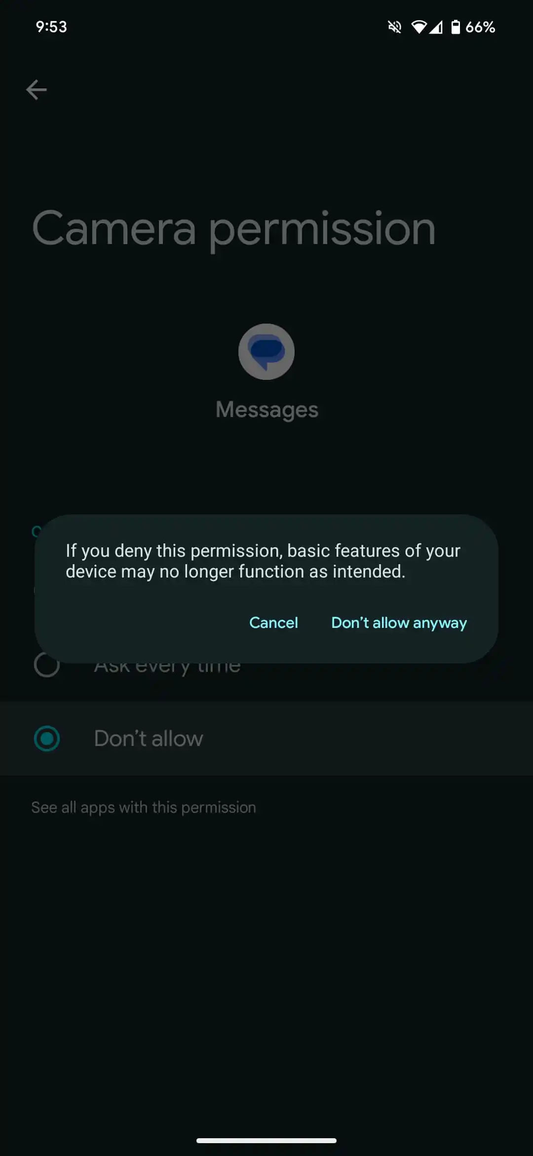 - Android, “bazı temel özelliklerin düzgün çalışmayabileceği” uyarısını gösterecek. “Yine de izin verme” diyerek onaylayabilirsiniz. Bu ayarı istediğiniz zaman geri alabilirsiniz.