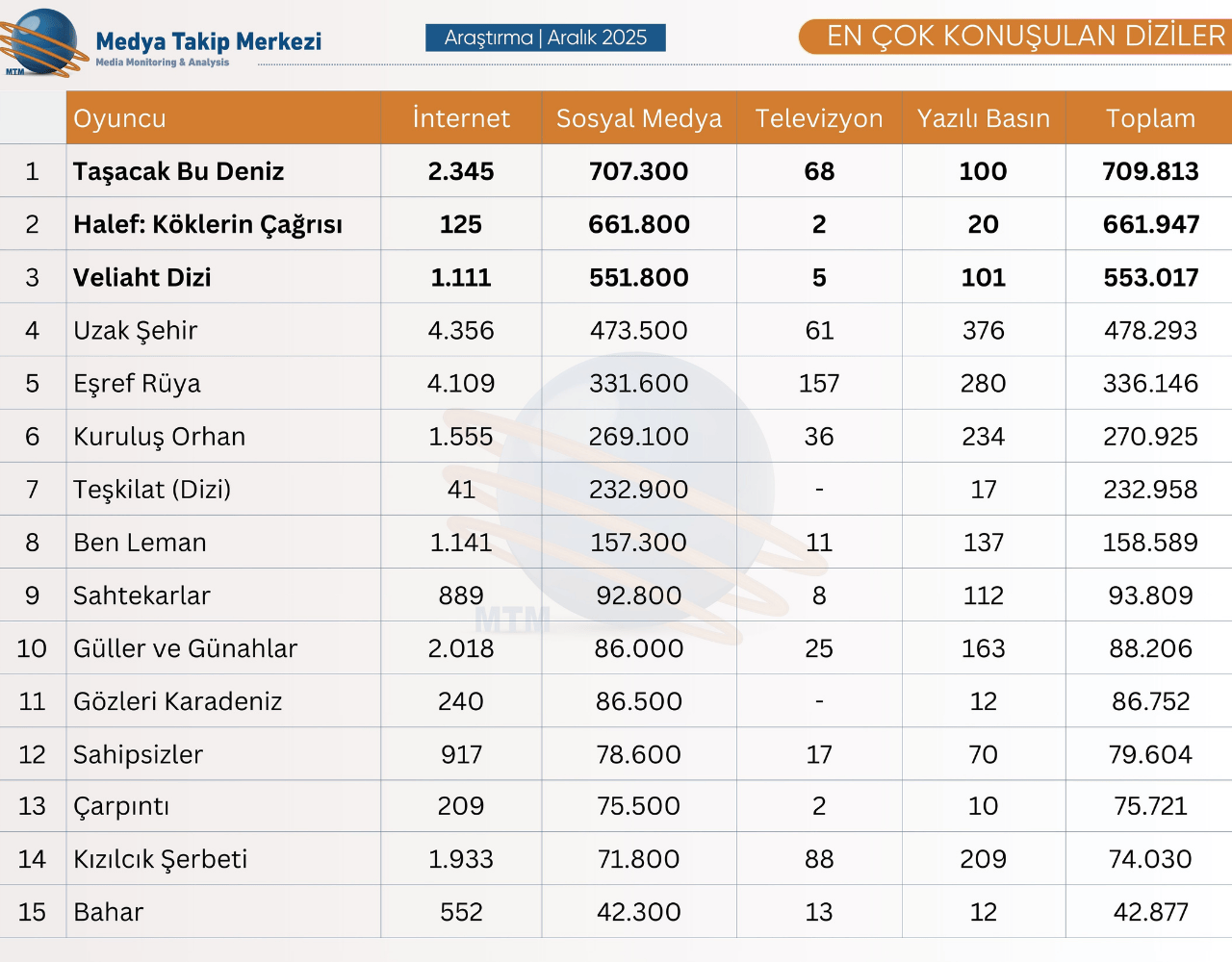 MTM Medya Takip Merkezi’nin Aralık 2025 raporuna göre, sosyal medyada “Taşacak Bu Deniz”, geleneksel medyada ise “Uzak Şehir” öne çıktı.